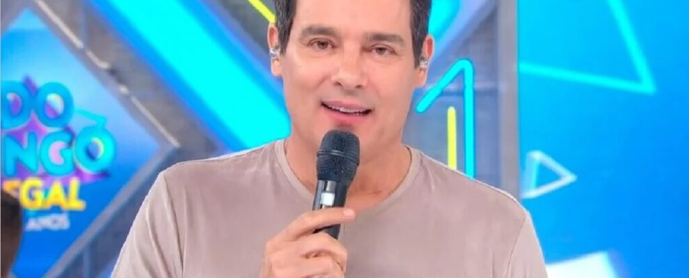 Celso Portiolli apresenta o programa Domingo Legal, do SBT, com um microfone na mão e um sorriso. Ao fundo, o logo do progra…