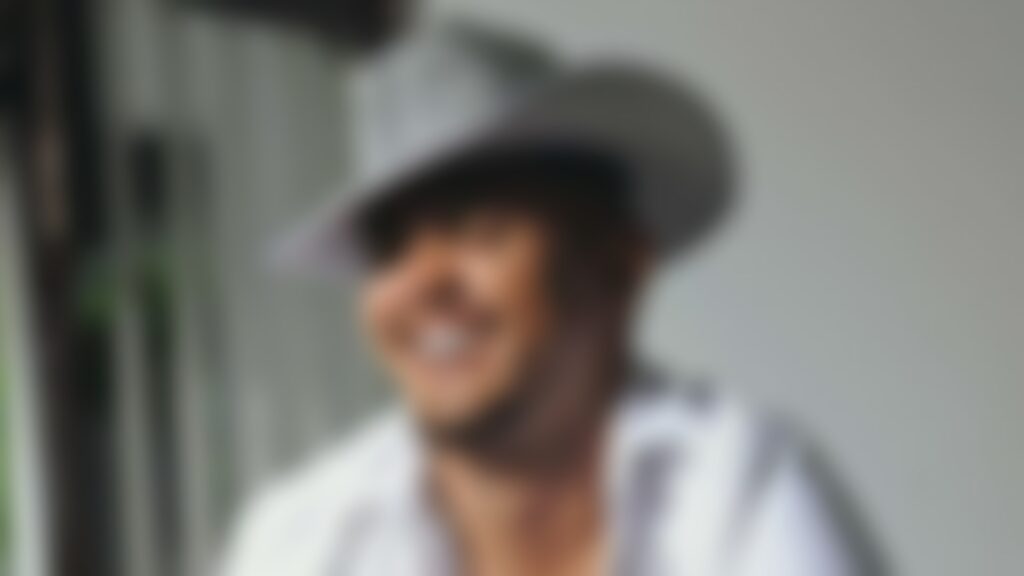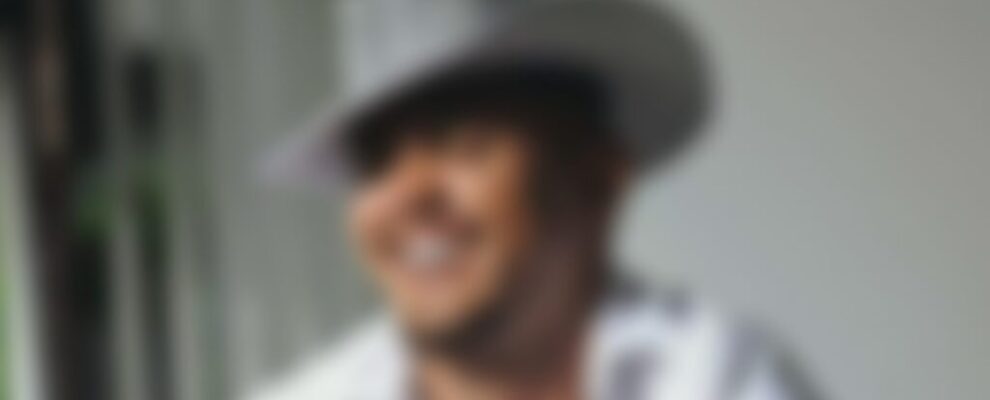 Homem sorrindo com chapéu e camisa branca, em close-up desfocado.