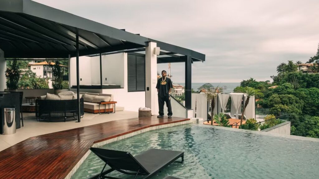A área externa da mansão é, sem dúvida, um dos pontos altos e mais impressionantes do imóvel, demandando um esforço construtivo considerável para sua execução. A piscina, um dos elementos centrais desse espaço de lazer, foi projetada para ser um oásis particular, com uma borda infinita que se confunde com a paisagem deslumbrante do mar de São Conrado. Ao redor da piscina, áreas de convivência com mobiliário de design convidam ao relaxamento e à socialização. Imagine desfrutar de um dia ensolarado ali, com amigos reunidos, drinks refrescantes e o som das ondas ao fundo. Para completar a experiência de luxo, a mansão conta com um heliponto particular, permitindo que Orochi e seus convidados cheguem e partam com total privacidade e agilidade. A segurança também é um ponto crucial, com sistemas de vigilância de última geração integrados à arquitetura, garantindo tranquilidade para o morador e seus visitantes. Essa área externa não é apenas um complemento, mas uma extensão da vida de ostentação e entretenimento que Orochi cultiva, um verdadeiro clube particular onde a diversão e o relaxamento são garantidos.