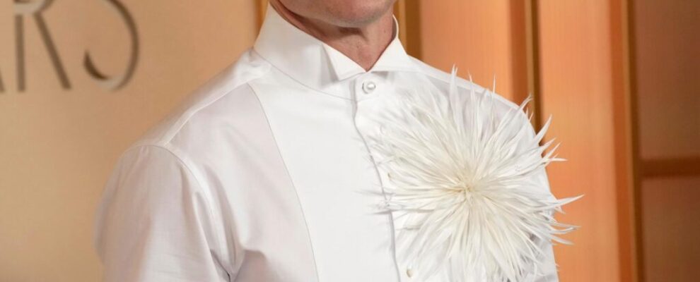 Ator Timothée Chalamet posa com camisa branca e detalhe de plumas brancas no ombro em evento.