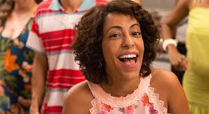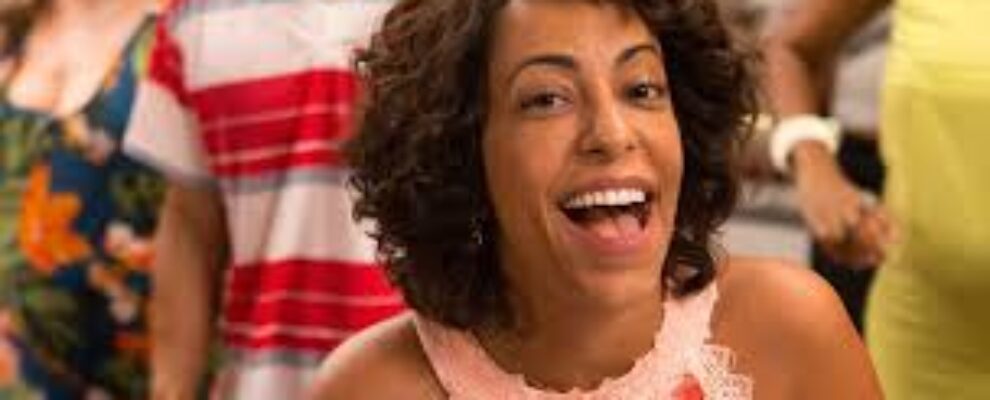 Atriz Taís Araújo sorri em cena de novela, com pessoas desfocadas ao fundo.