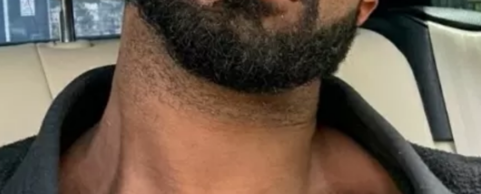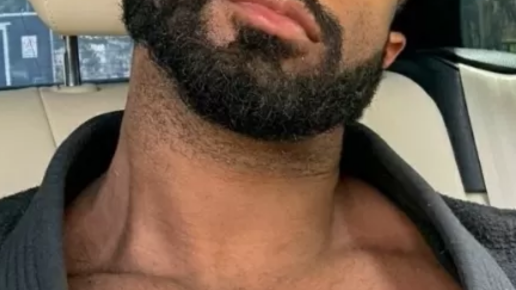 Close-up do rosto de um homem com barba, mostrando o pescoço e parte do peito, com um roupão cinza.