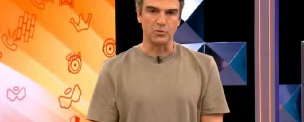 Tadeu Schmidt, apresentador do Big Brother Brasil, em estúdio com fundo temático de ícones e formas geométricas.