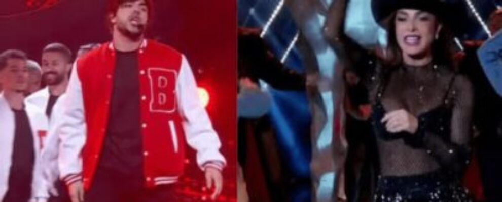 Jovem cantor com jaqueta de time e mulher com chapéu de cowboy em palco de show