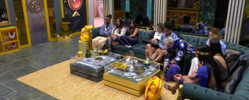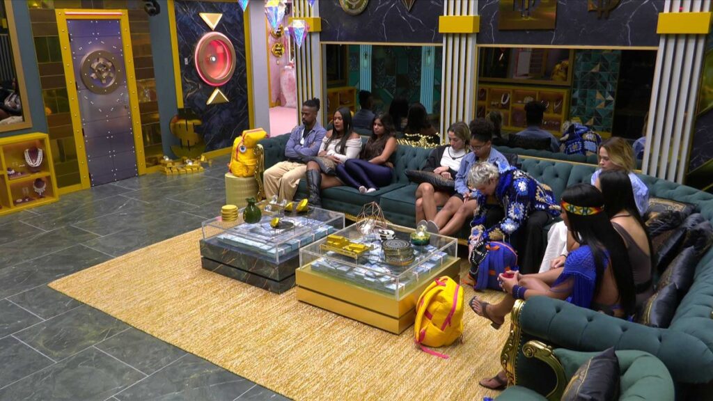 Grupo de pessoas sentadas em um sofá em uma sala decorada com dourado e azul, possivelmente em um reality show.