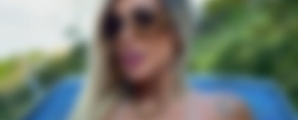 Mulher loira com óculos escuros e batom rosa, usando um colar, em um ambiente externo com folhagens ao fundo.