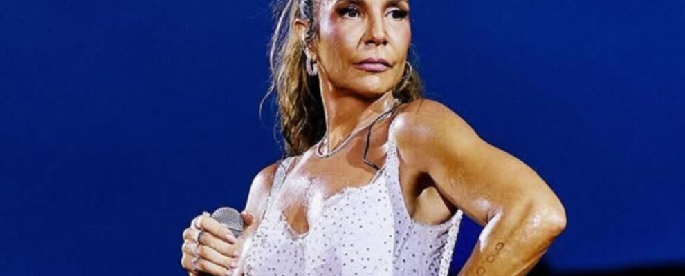 Ivete Sangalo em show, cantora usa vestido branco com brilhos e segura microfone. Fundo azul.