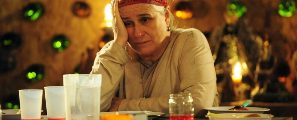 Atriz Vera Holtz com a mão na testa, pensativa, sentada à mesa com copos e pratos em um ambiente rústico com luzes verdes.