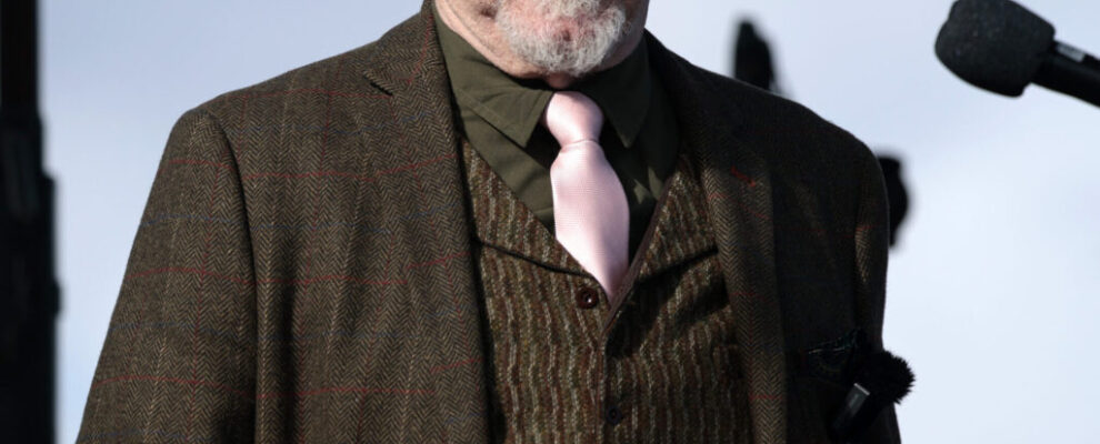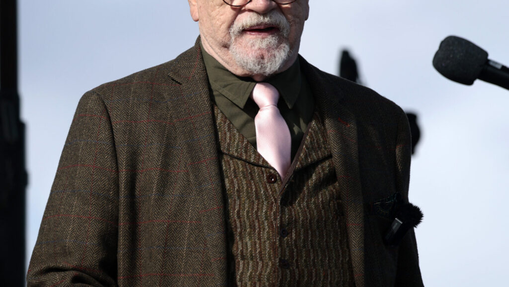 O ator Brian Cox, conhecido por interpretar Logan Roy em Succession, em um evento com microfone.