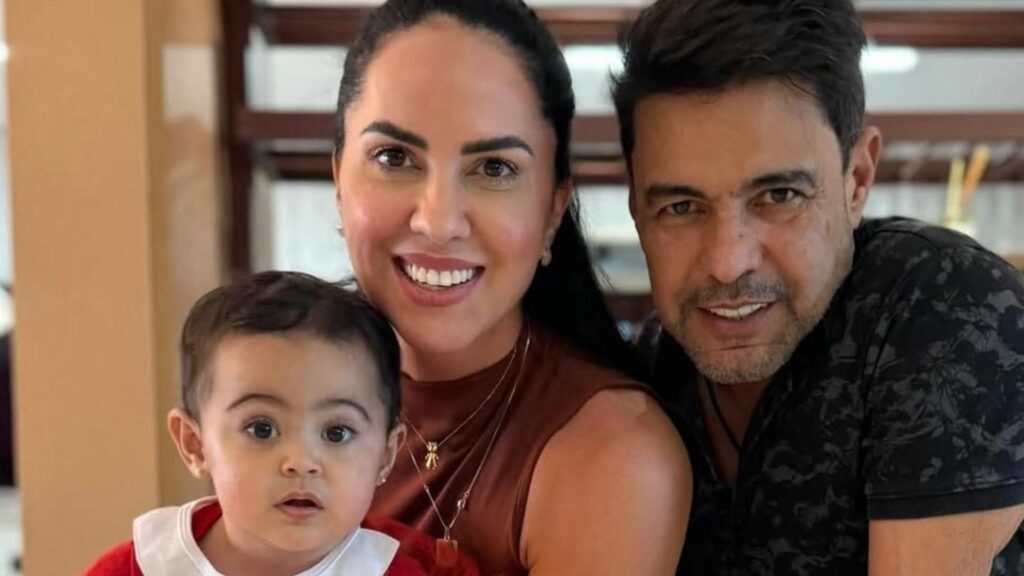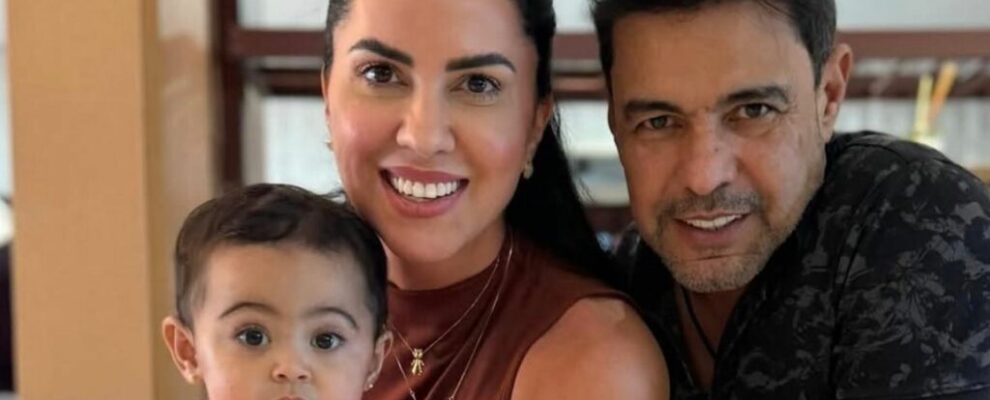 Graciele Lacerda, Zezé Di Camargo e o filho, José Marcus, em momento familiar. O casal sorri para a câmera.