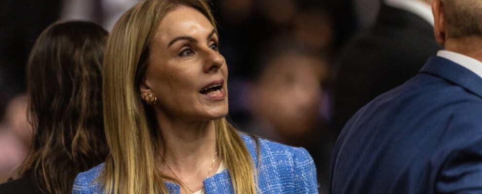 Mulher loira com blazer azul e branco fala em evento público, com pessoas desfocadas ao fundo.