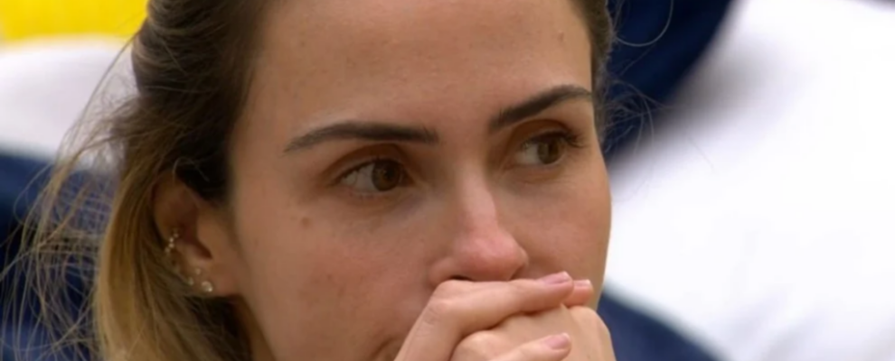 Mulher com as mãos no rosto, pensativa. Possível participante de reality show.