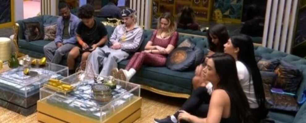 Participantes do BBB 23 sentados em um sofá, alguns olhando para o celular, em uma sala decorada com sofás e mesas de centro.