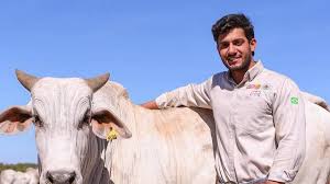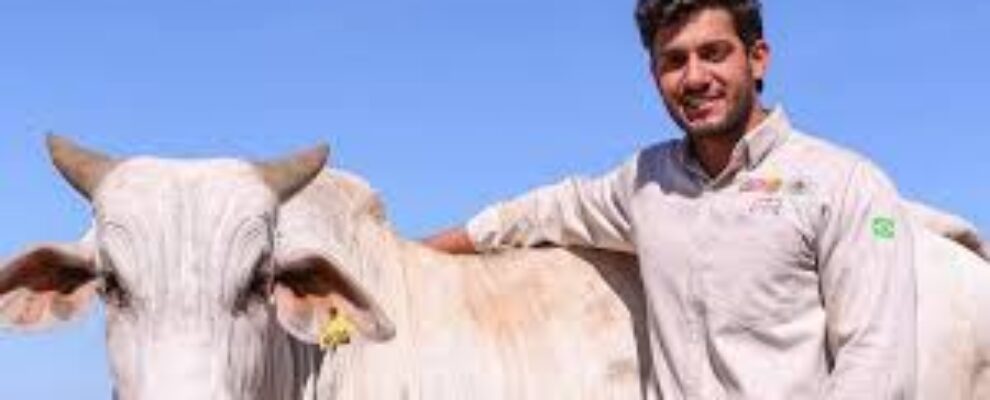 Jovem pecuarista sorri ao lado de um boi Nelore em dia ensolarado, com céu azul ao fundo.