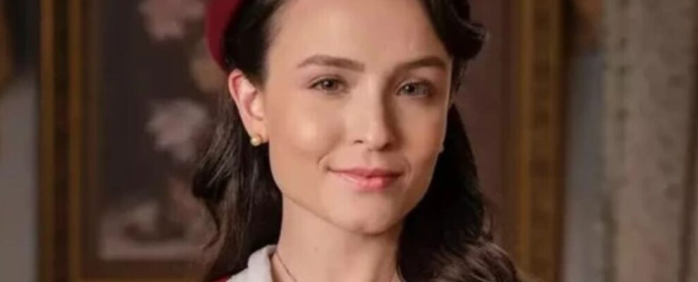 Atriz Alice Wegmann sorri em close-up, usando boina vermelha e casaco, em cena de novela.