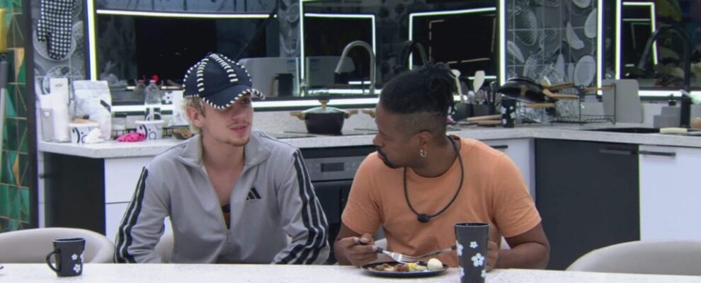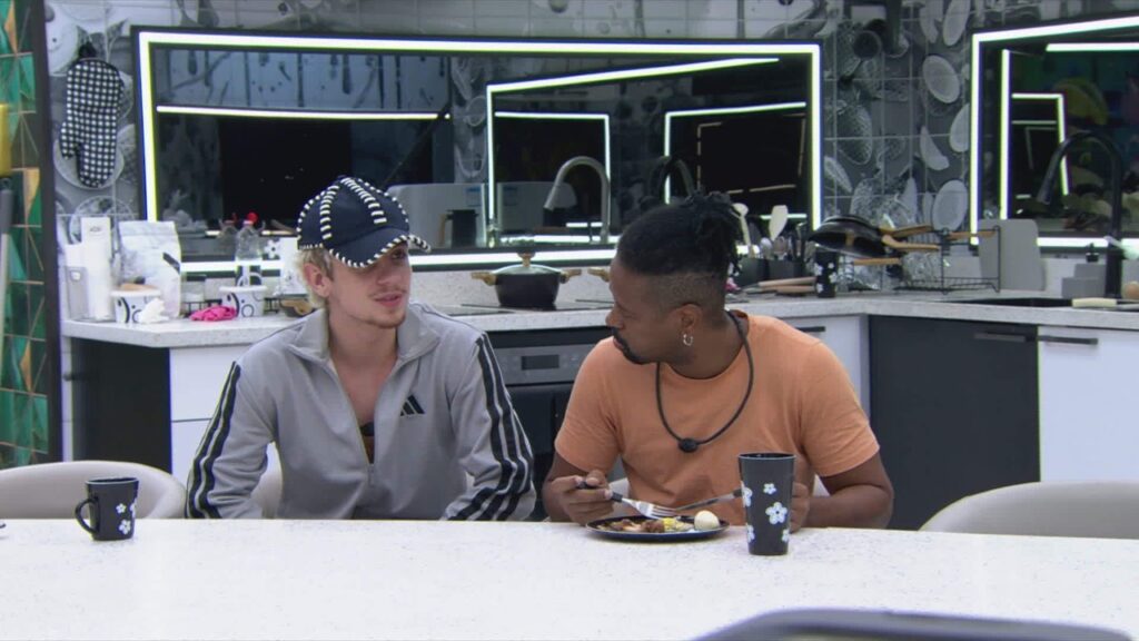 Dois homens conversam sentados à mesa em uma cozinha moderna. Um usa boné e jaqueta, o outro veste camiseta laranja.