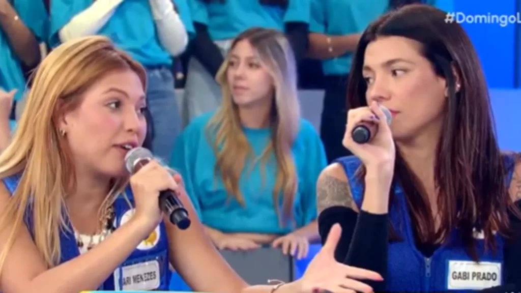 Mari Menezes e Gabi Prado em um programa de TV com o logo #DomingoLegal ao fundo.