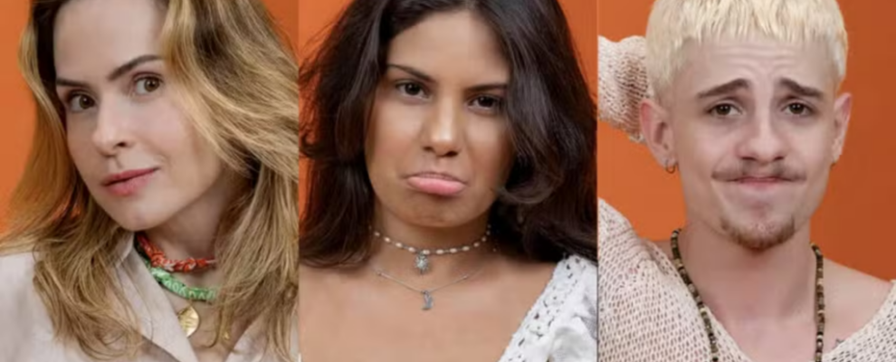 Três participantes do BBB 23: Bruna Griphao, Sarah Aline e Gabriel Santana em um painel com fundo laranja.