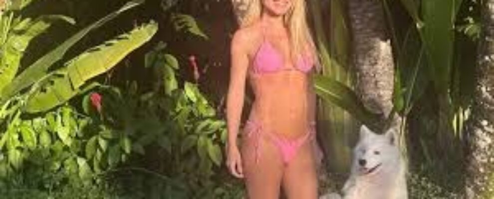 Gracyanne Barbosa posa de biquíni rosa com seu cachorro em um cenário tropical ensolarado.