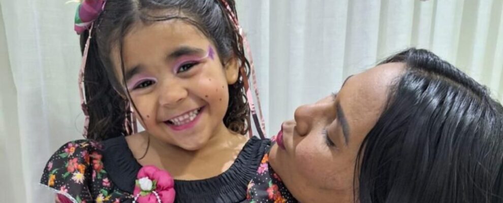 Menina sorridente com maquiagem e vestido de festa junina, recebendo um beijo da mãe.