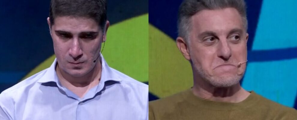 Luciano Huck e Tiago Leifert em programa de TV. Os apresentadores aparecem em quadros separados, com expressões faciais dist…