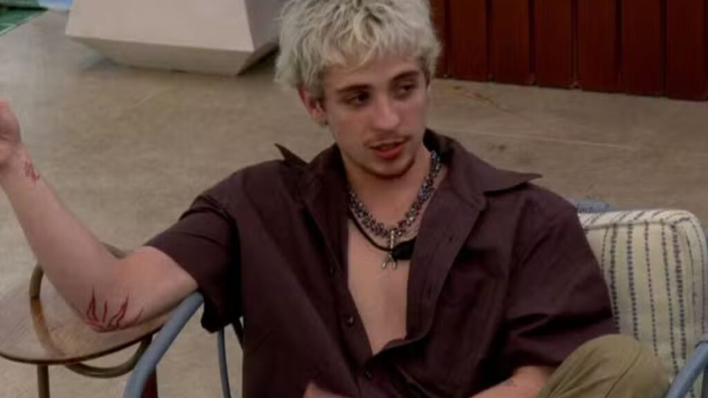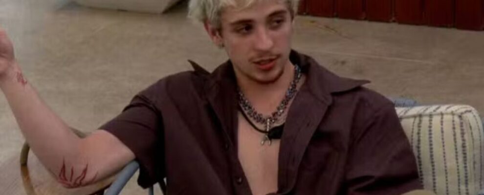 Homem jovem com cabelo loiro platinado e tatuagem no braço, usando camisa aberta e colar, em um ambiente interno.