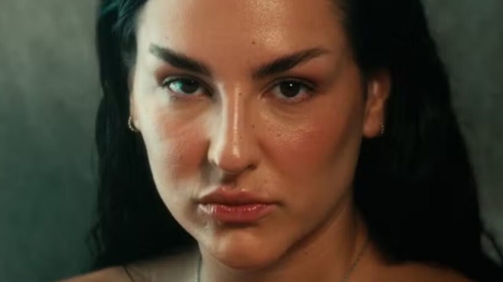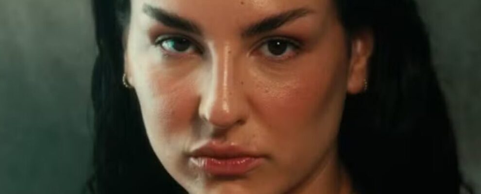 Close-up de uma mulher com cabelo escuro e maquiagem, olhando para a câmera com expressão séria.