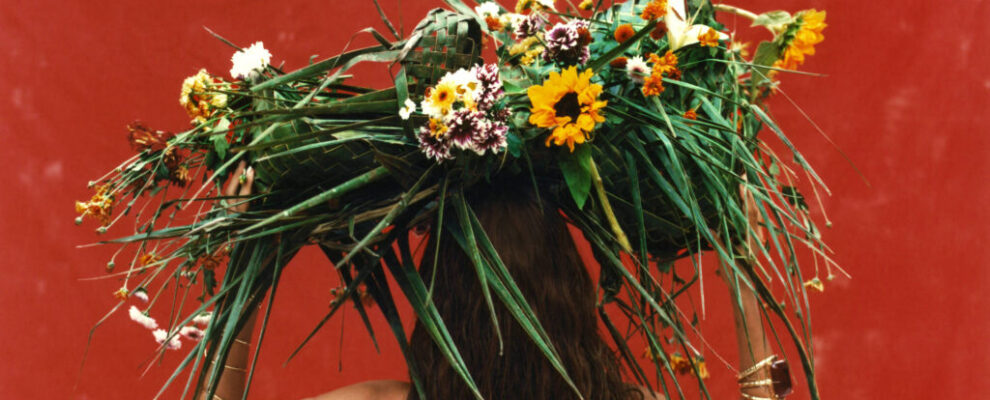 Anitta carrega um grande arranjo de flores e folhagens sobre a cabeça em capa de álbum com fundo vermelho.