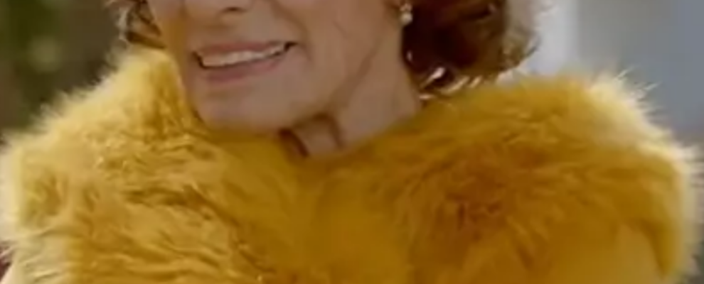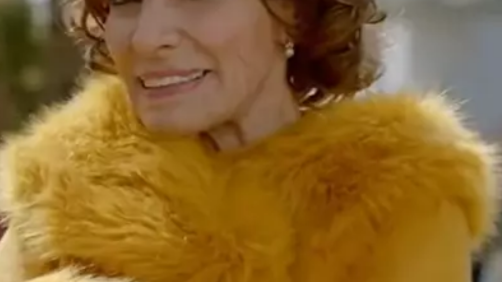 Atriz brasileira Maitê Proença sorri usando um casaco de pele amarelo vibrante em cena externa.