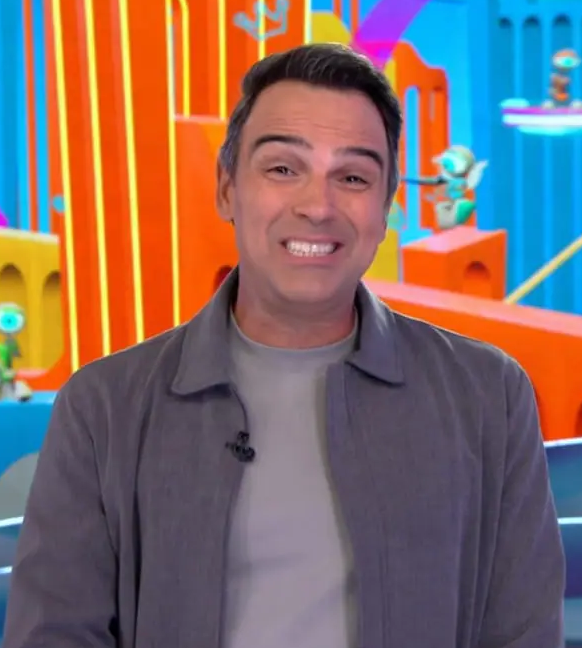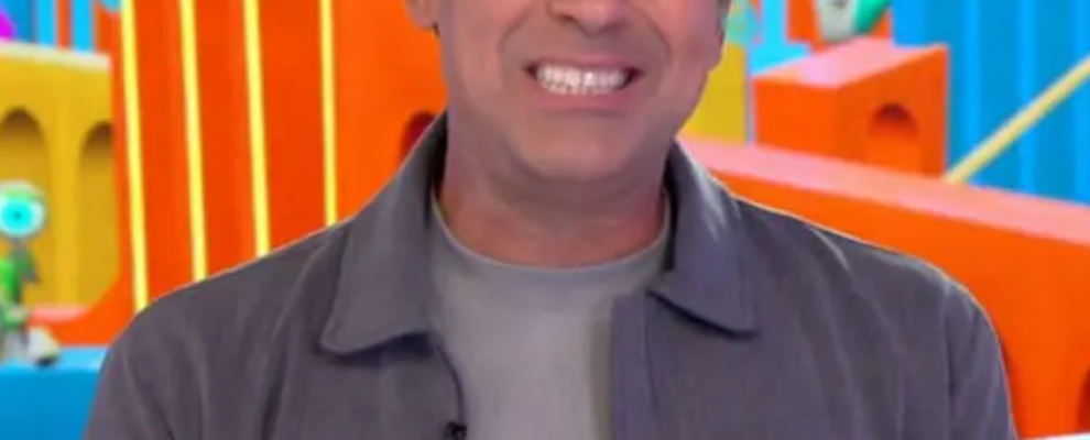 Apresentador Luciano Huck sorri para a câmera em um cenário colorido com elementos lúdicos e robôs ao fundo.