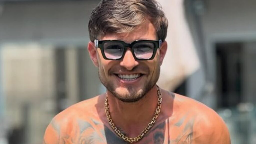 Homem sorrindo com Ăłculos escuros e corrente de ouro, com tatuagens visĂ­veis no peito e ombros.
