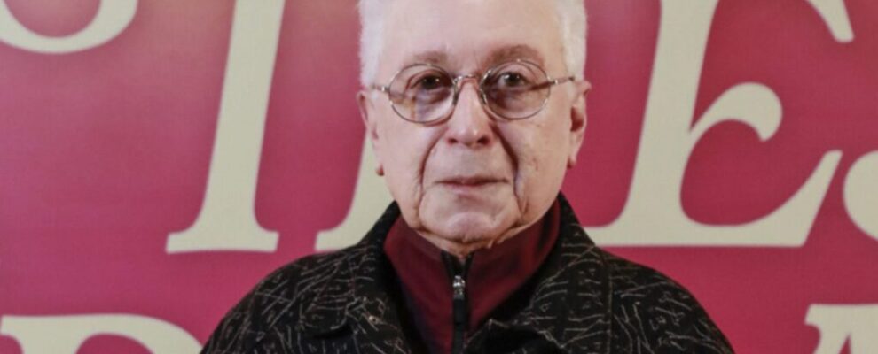 O ator e diretor de teatro, Aderbal Freire-Costa, em evento com fundo rosa e letras brancas. Ele usa óculos e um casaco esta…