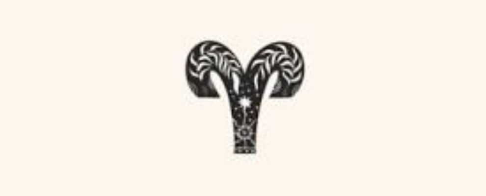 Símbolo do signo de Áries com detalhes ornamentais e estrelas em preto e branco sobre fundo bege claro.