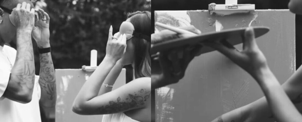 Casal com os olhos vendados pintando um quadro em cavalete ao ar livre. Imagem em preto e branco.