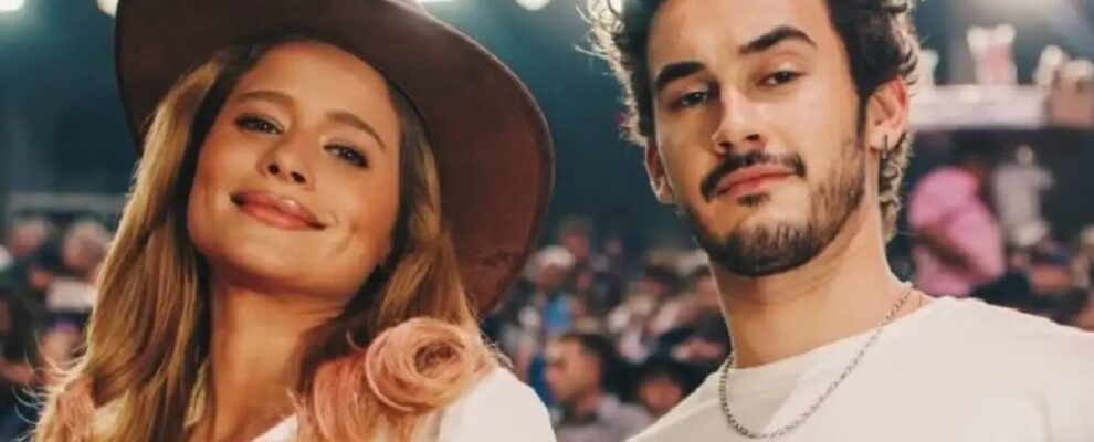 A cantora Ana Castela e o cantor Gustavo Mioto posam para foto em evento, ambos sorrindo.