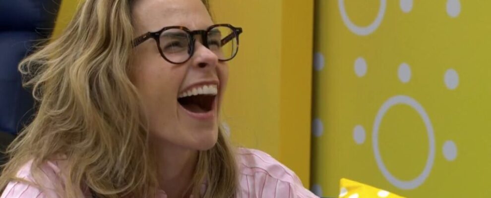 A mulher com óculos e cabelo loiro está rindo com a boca aberta, usando uma camisa listrada rosa e branca.
