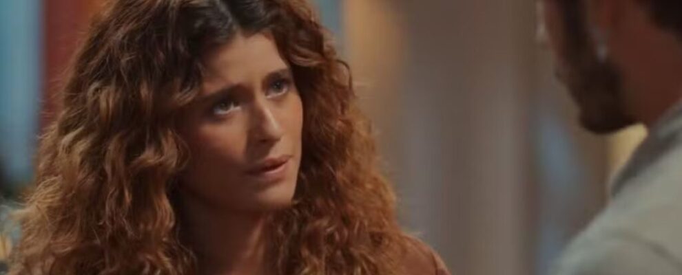 Atriz com cabelos cacheados ruivos olha para o lado, em cena de novela. Ao fundo, parte do rosto de um homem.
