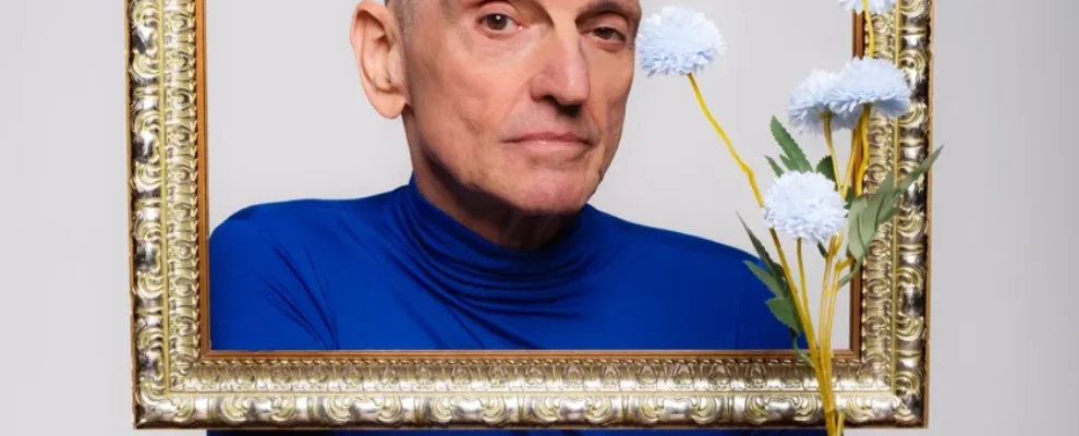 Homem com pele clara, cabelo grisalho curto e camisa azul de gola alta, segurando um ramo de flores azuis artificiais atrás …