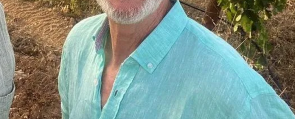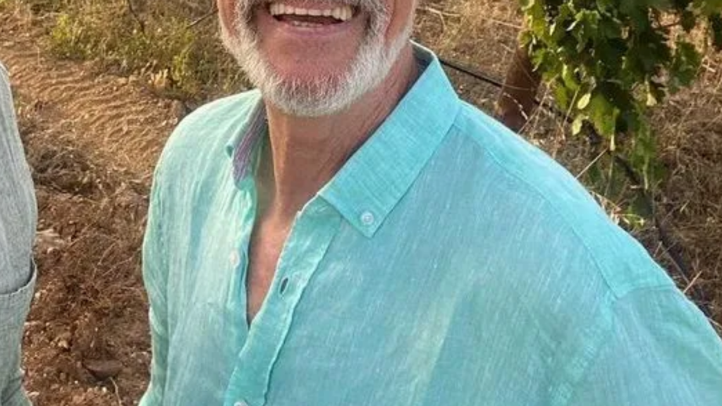 Homem sorridente com barba grisalha e camisa azul clara em um vinhedo.