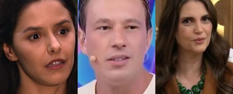 Trio de apresentadores: Thais Fersoza, André Lodi e Giovanna Ewbank em um programa de TV.