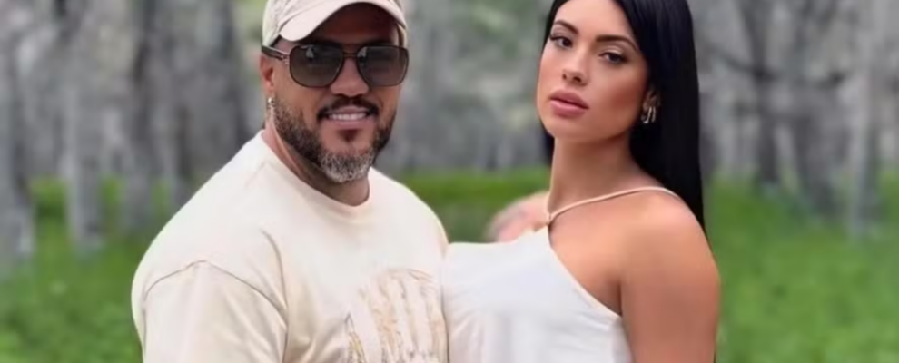 O cantor Belo e a influenciadora Gracyanne Barbosa posam juntos em um ambiente externo com vegetação ao fundo.